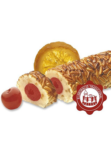 Ingredientes: Azúcar, almendras (38%), frutas confitadas (20%) (cereza 5%, piel de naranja 5%, sacarosa, fructosa, dextrosa, maltosa, conservadores (E-202, E-223 (contiene sulfitos)), acidulante (E-330), colorante (E-127)), piñones (10%), jarabe de glucosa, sorbitol, conservadores (E-200, E-202).