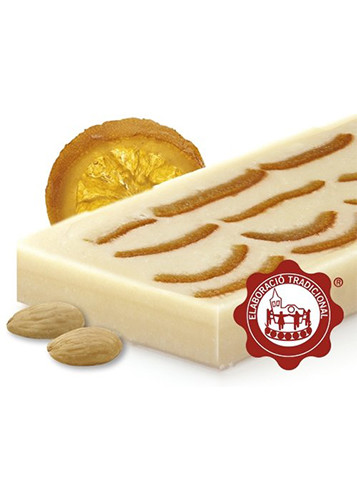 Ingredientes: Almendras (45%), azúcar, fruta confitada (25%) (piel de naranja 12%, sacarosa, fructosa, dextrosa, maltosa, conservadores (E-202, E-223 (contiene sulfitos)), acidulante (E-330)), jarabe de glucosa, miel, conservadores (E-200, E-202).